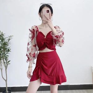 2023 Korean Swimsuit Ladies Fused Swim Suit Plus Size Swimwear 5XL Skirt Mesh Lace Long Sleeve Bathing Suit One Piece Tankinis