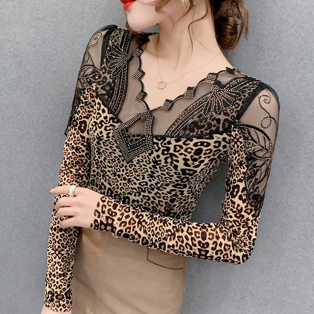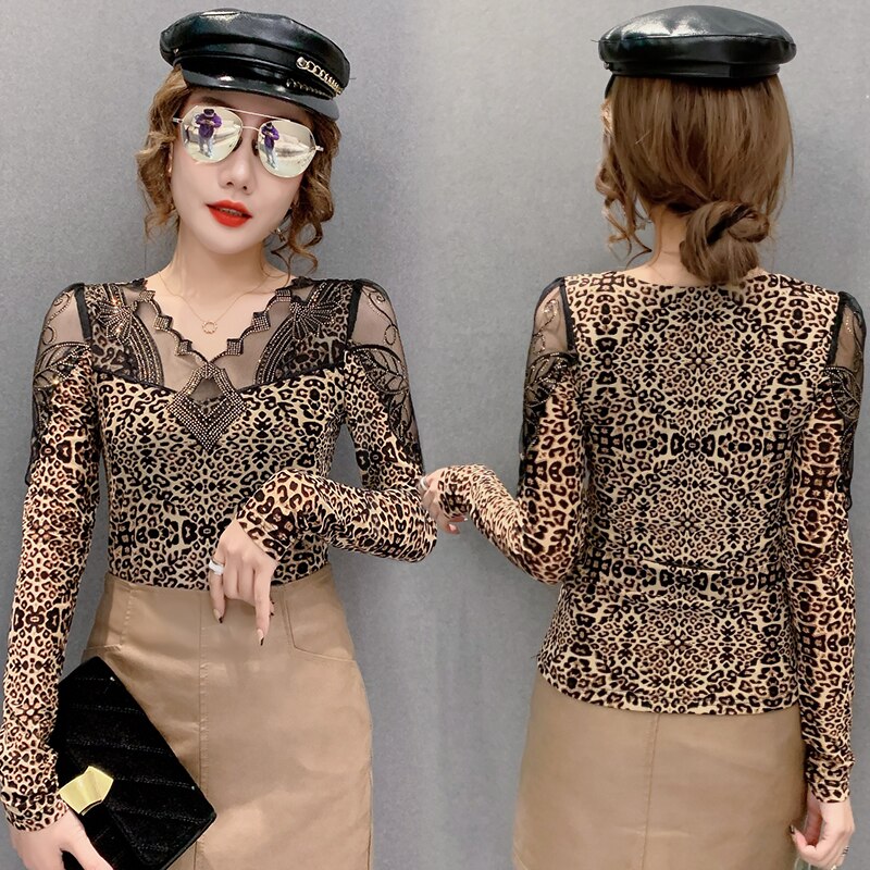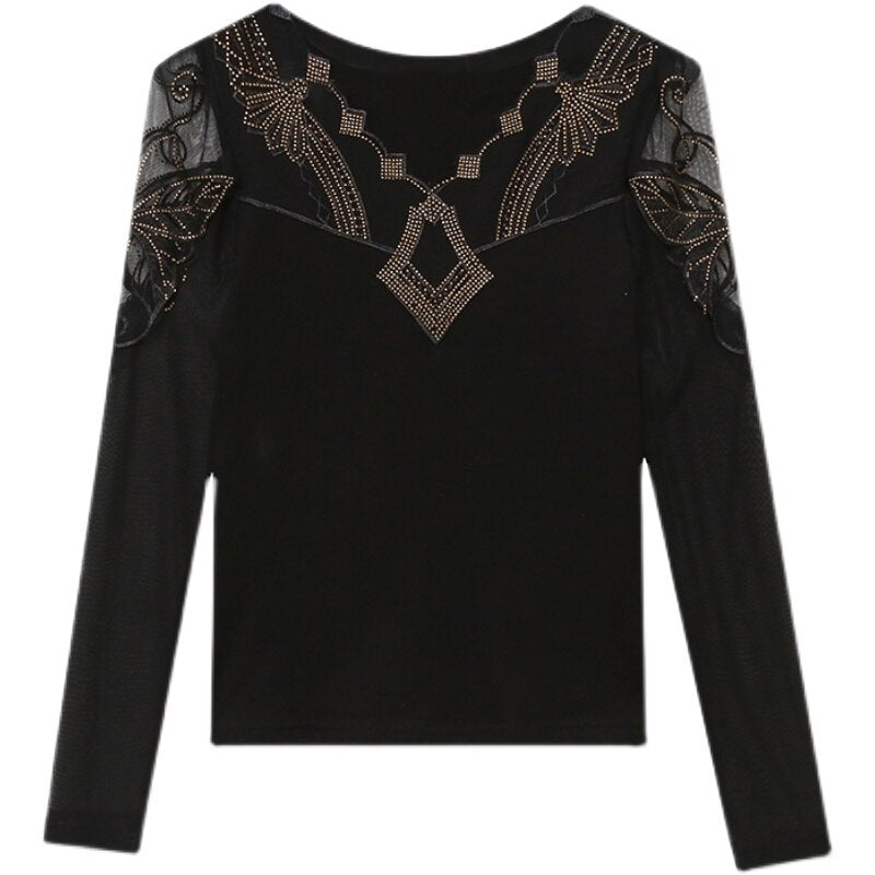 2021 Spring New Women T-shirt Fashion Diamond lace long-sleeved Tops Elegant Slim Hot drilling Tees Plus Size Lady Blusas