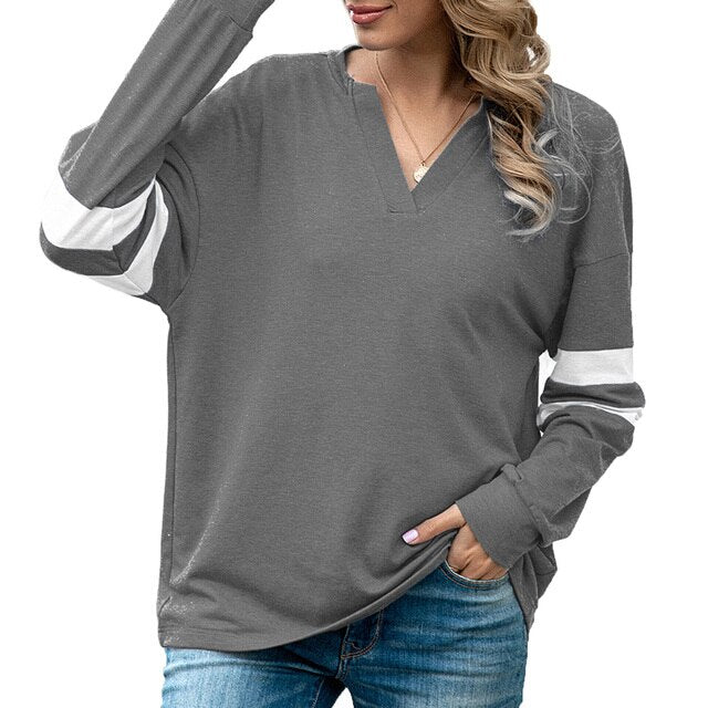 Autumn New Women t-Shirt Long Sleeve V-Neck Tee Shirt Femme Fashion Stripes Splicing Loose Fit Casual Tees Mujer Tunic Tops