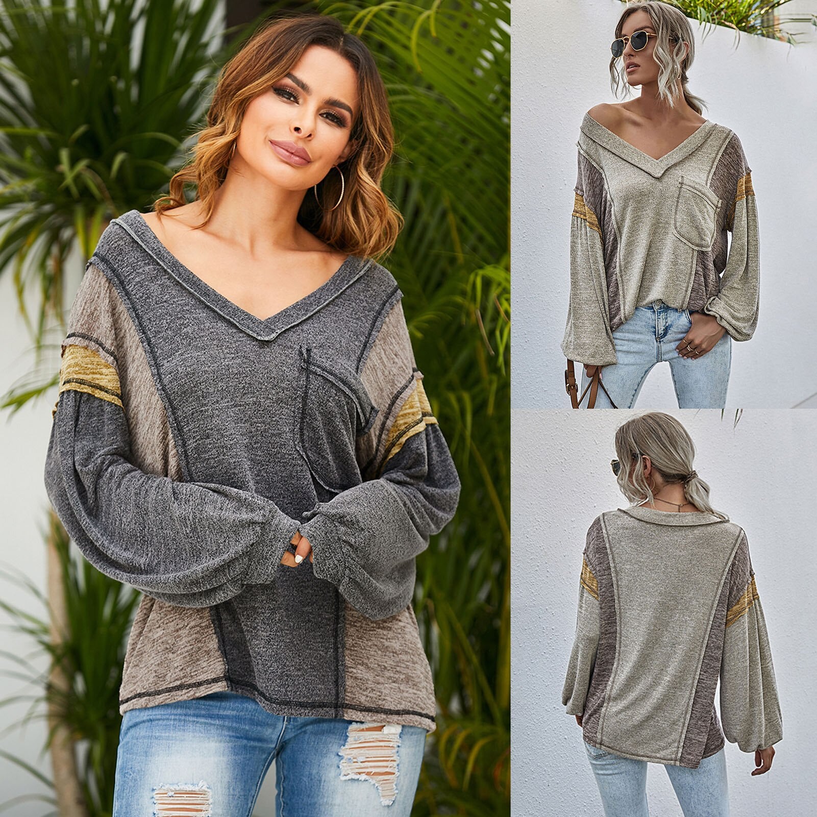 Winter New Women Autumn T-Shirt Fashion Splicing Sexy V Neck Pocket Design Lantern Sleeve Tees Casual Loose Female Tops