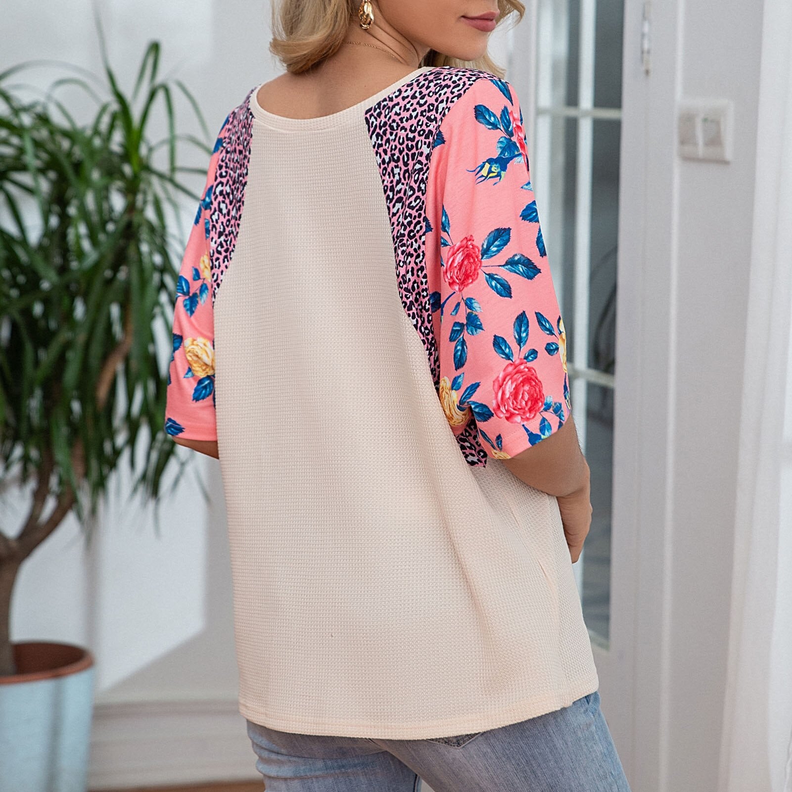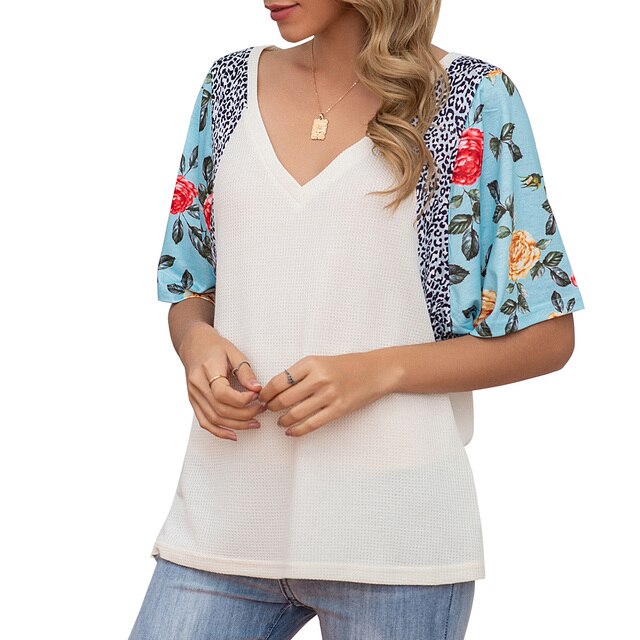 Women T Shirt 2021 Spring Summer Tees Waffle Knit Sexy V Neck Floral Leopard Print Splicing Sirts Loose Casual Female Tops