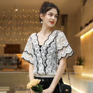 • 2pcs Short Sleeve Elegant V Neck Female Summer Tops Lace T Shirts Feminina For Women Tees Korean Clothes Vintage Friends Office