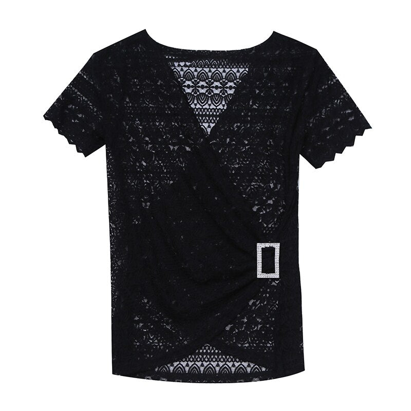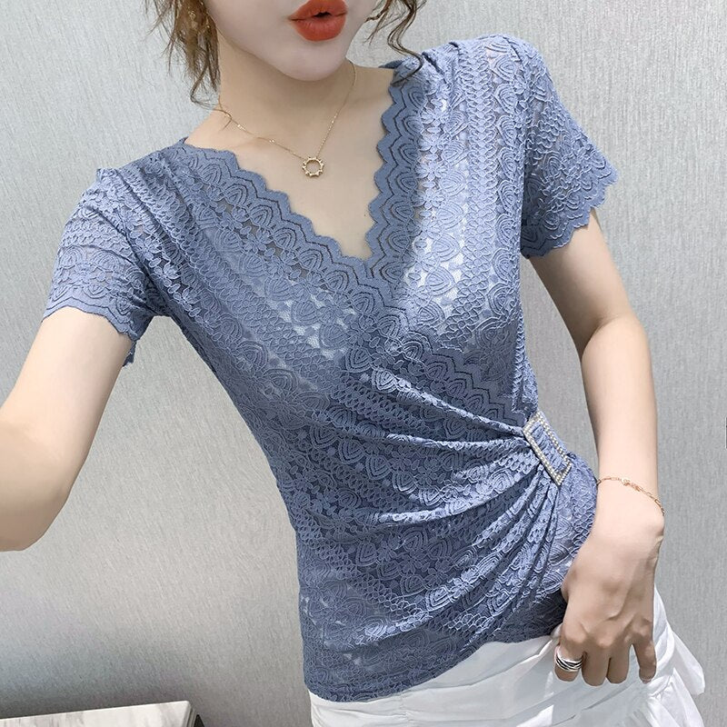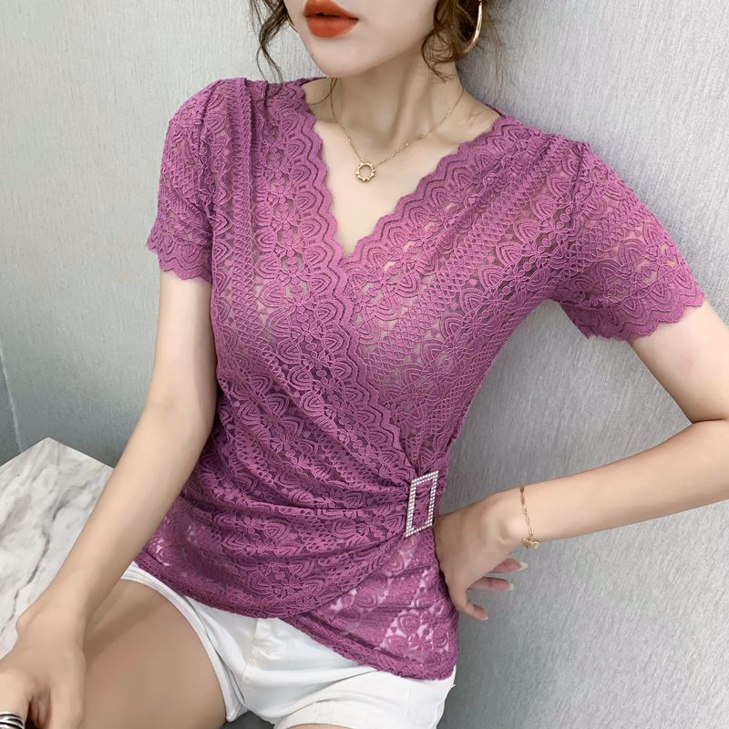 2020 New Summer short sleeve v-neck lace tops Fashion casual hollow out lace t-shirts women tops Elegant slim women blusas