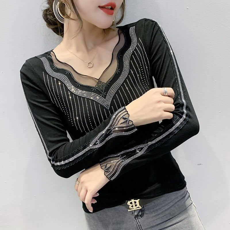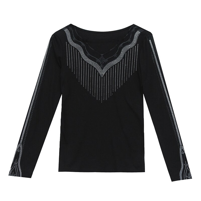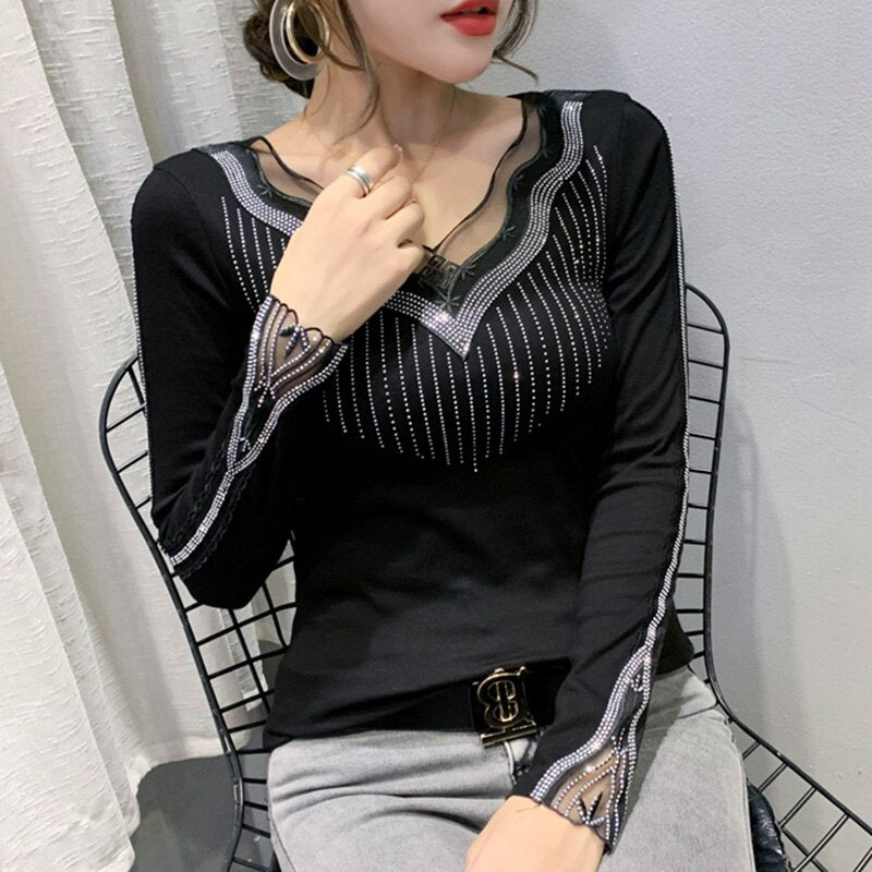 New 2020 Autumn Women Tops Fashion Casual Long Sleeve V-Neck T-shirt Elegant Slim Diamonds Black Plus Size Women's tshirts