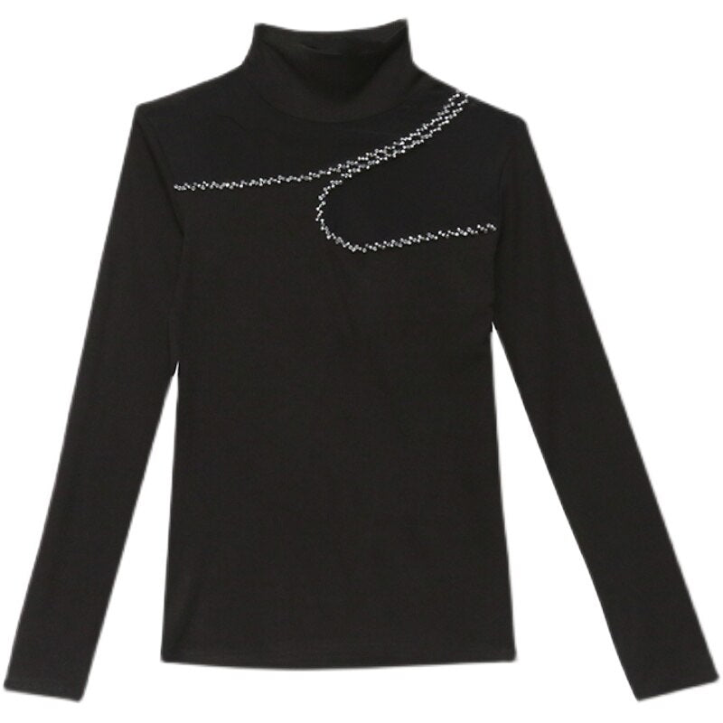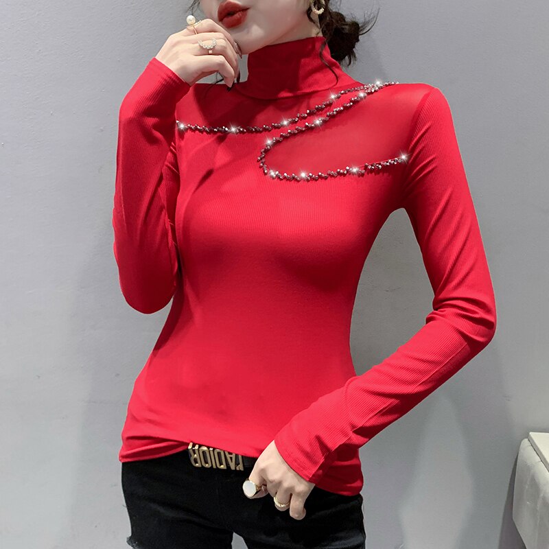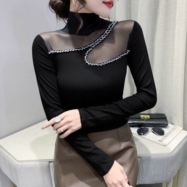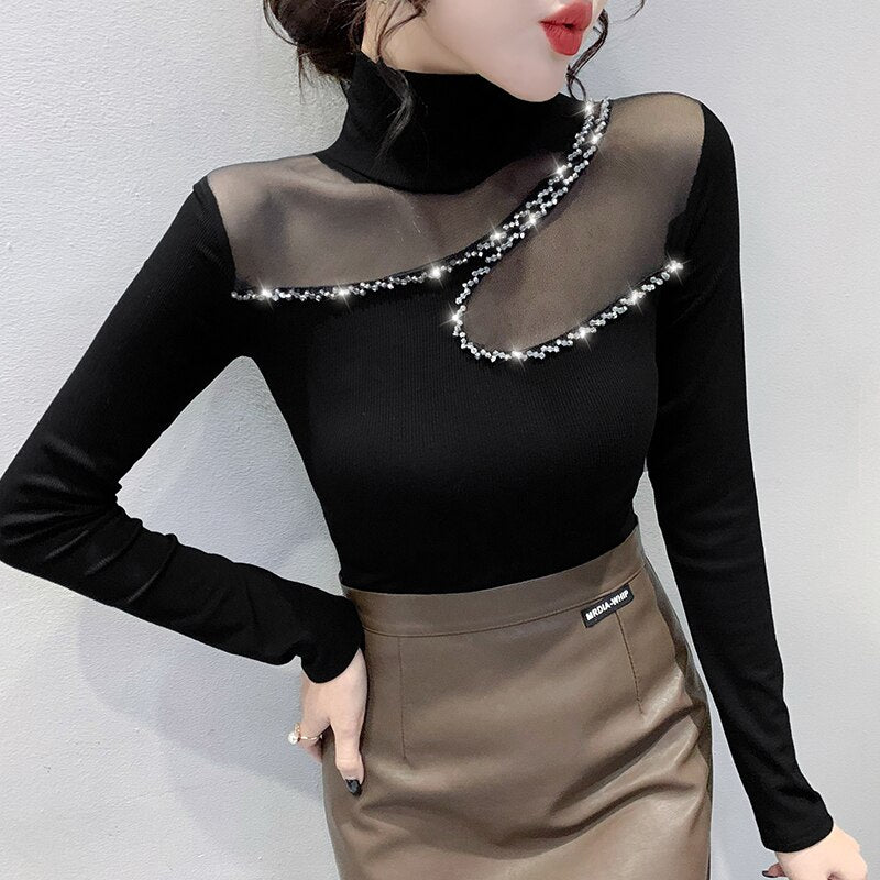 New 2021 Autumn Women Tops Fashion Casual Turtleneck Long Sleeved Mesh T-Shirt Elegant Slim Diamond perspective Women Clothing