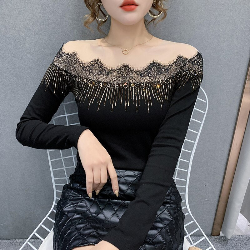 New 2021 Spring Autumn Women Tops Fashion Sexy Long Sleeve Mesh Shirt Elegant Slim Hot Drilling Lace t-shirt Blusas