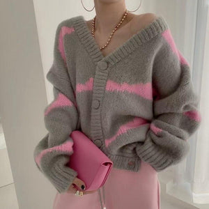 • Chic Panelled V Neck Long Sleeve Sweater Single Breasted Elastic Knit Cardigan 2021 Fashion Tide Loose Women Tops Coat