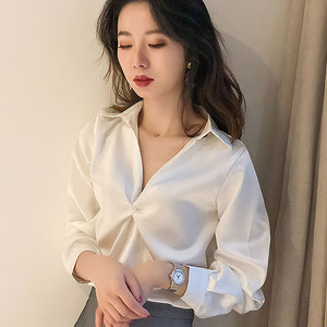 • New 2021 Autumn Women Tops Fashion Casual V-neck Versatile Slim Long-sleeved Bright Silk Bottoming Shirt Blusas