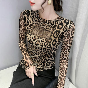 • New Autumn Winter Women Tops Fashion Long Sleeve Hollow Out Hot Drilling Mesh T-Shirt Plus Size Women Clothing