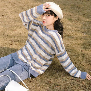 • Women O Neck Color Block Stripe Long Sleeve Sweater Japanese Winter Kawaii Girl Pullover Black Vintage Outerwear Women Tops
