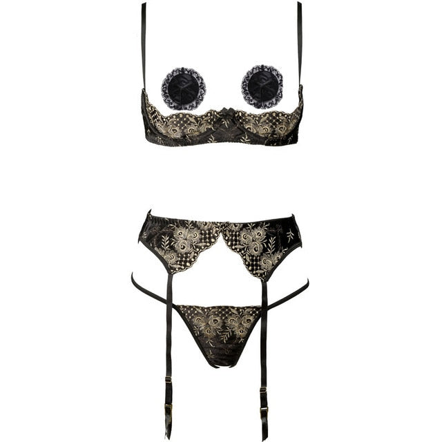 1/4 Cup Sexy Bra Crotchless Panties Set Embroidery Lingerie Thin Temptation Bra and Panty with Garters Sets Women Intimates