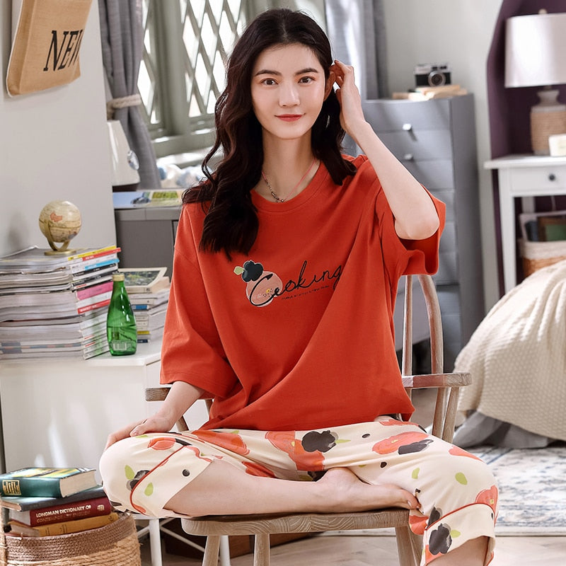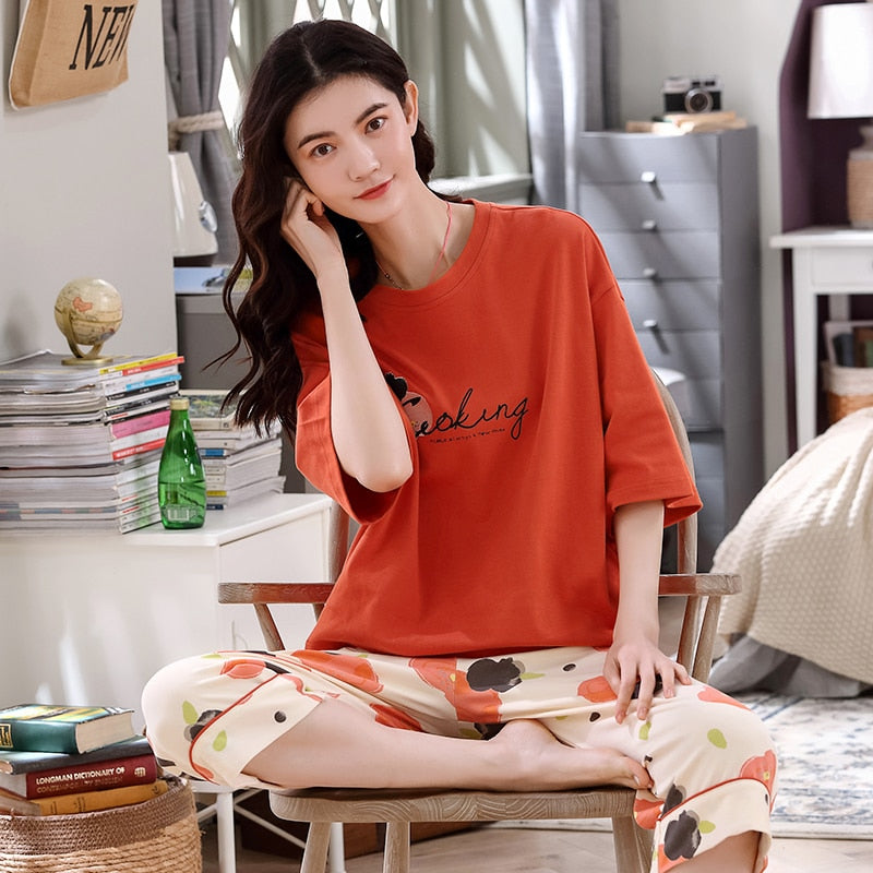 100% Cotton Pajamas Set Women Pajamas Home Wear Short Sleeve Casual Pajama Set Female Loose Sleepwear Loungewear XXL XXXL 4XL