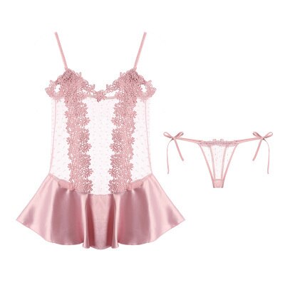 2019 Sexy Cute Lace Perspective Ice Silk Stretch Wave Princess Dress Sexy Strap Nightdress Suit Four Colors Lingerie Mini Dress