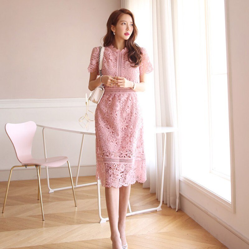 2020 summer new Korean ladies temperament Pink lace round neck waist slimming long air lace dress Knee-Length Short sleeve