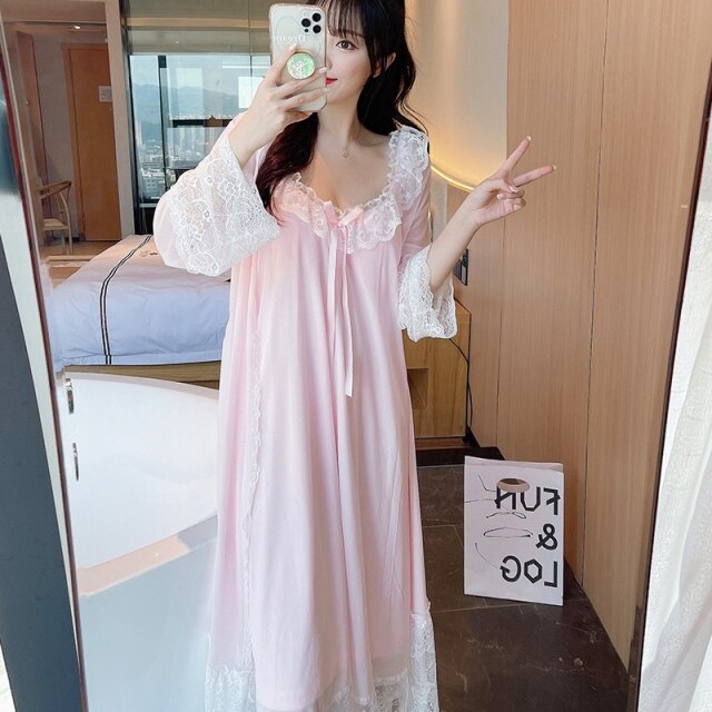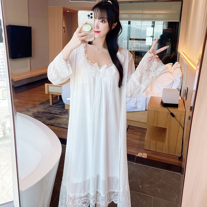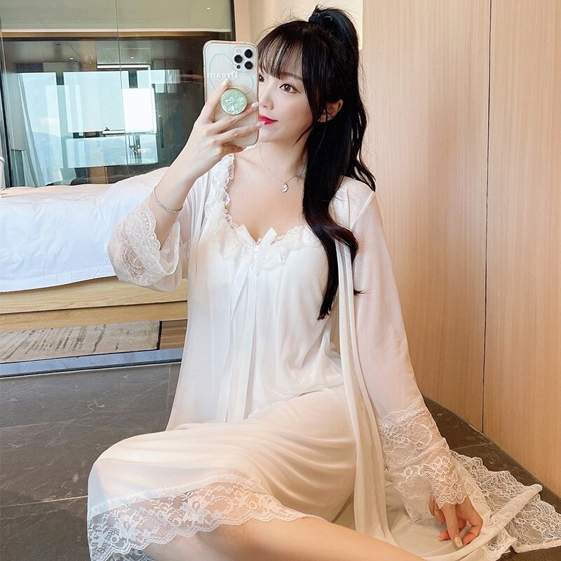 2021 Autumn 2PCS Sexy Lace Bow Lingerie Nightgowns Robes Sets for Women Cotton Bathrobe Sleepwear Nightdress Night Dress Nighty