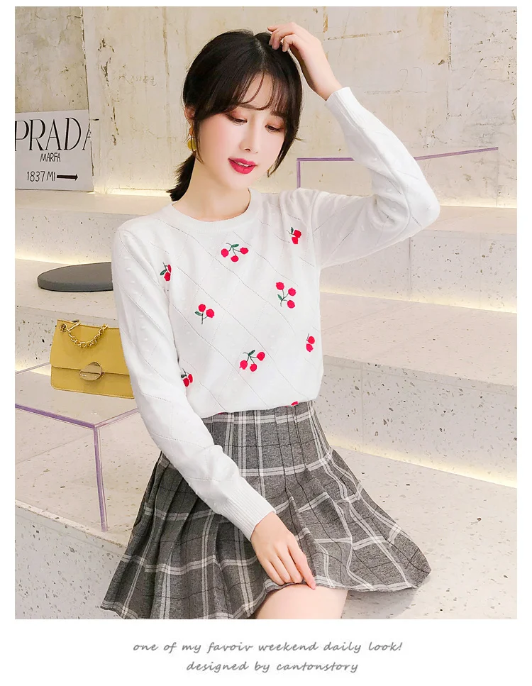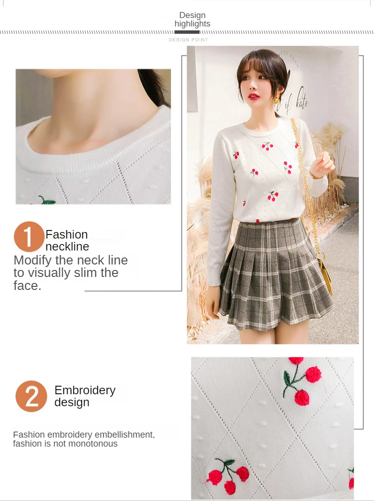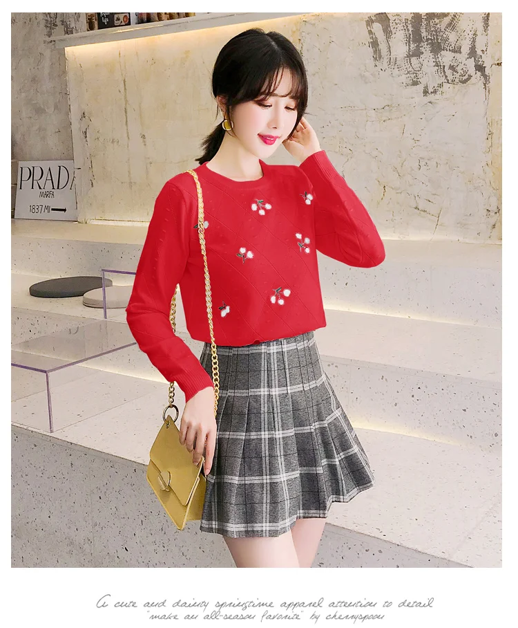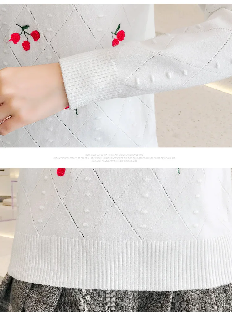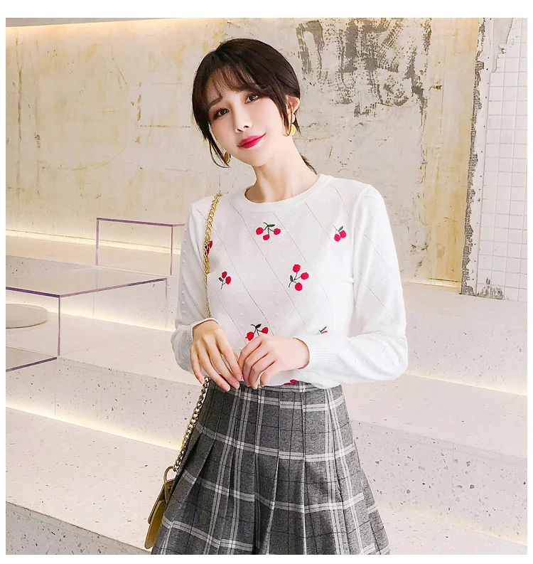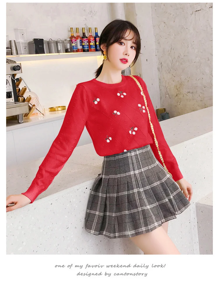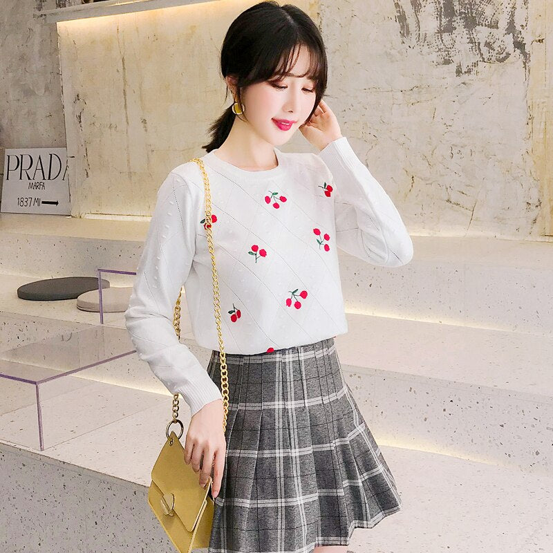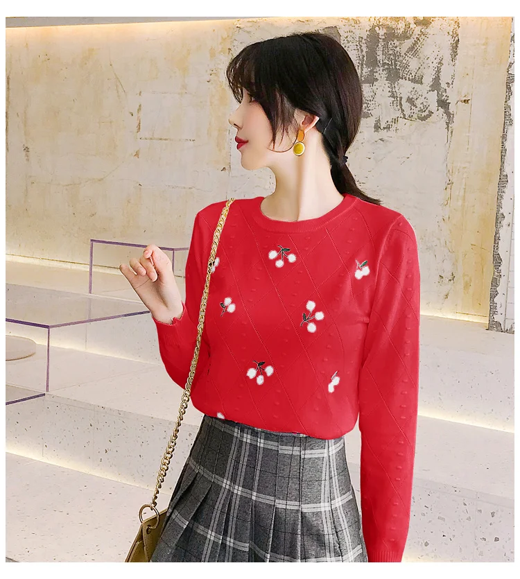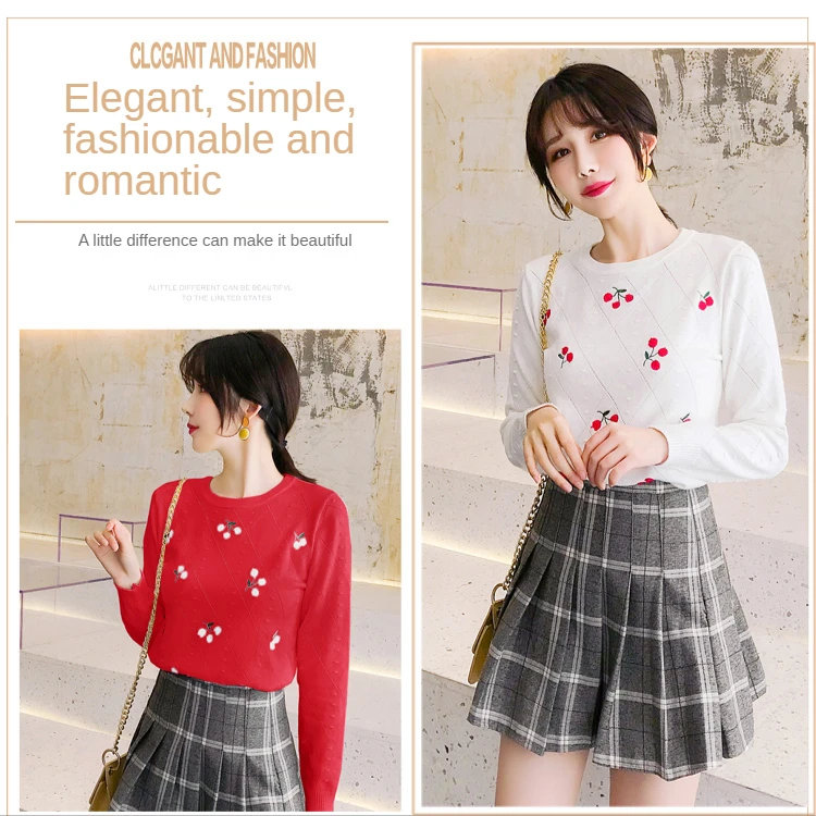 2021 Autumn Net Red Cherry Print Korean Sweater Pullover Sweater Bottoming Shirt Top Heavy Industry Women