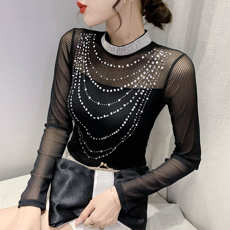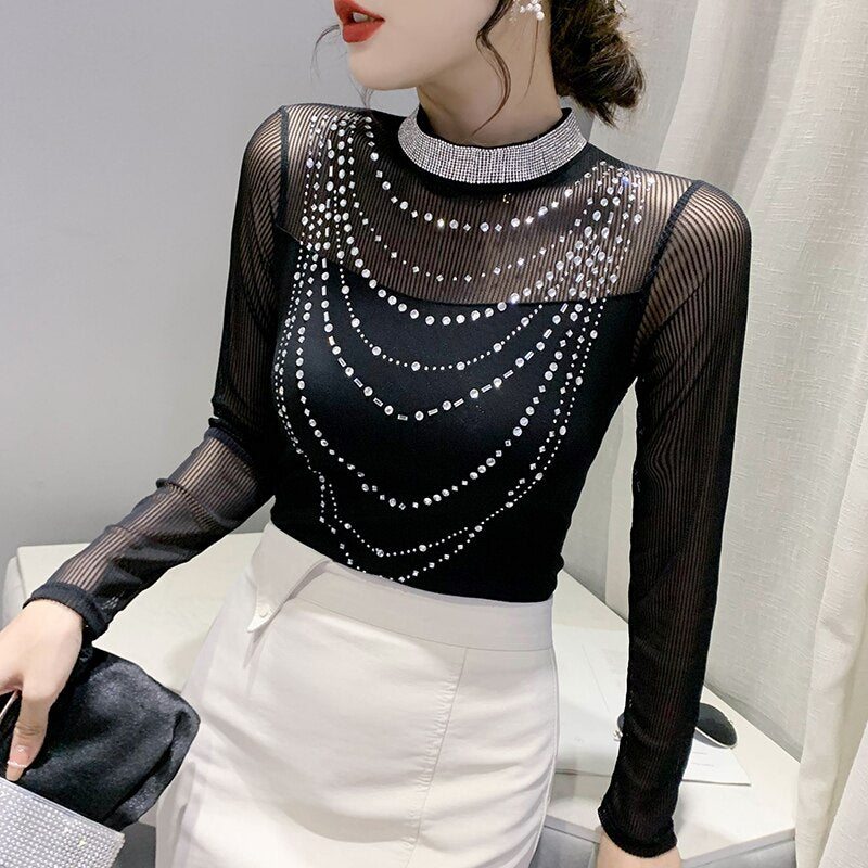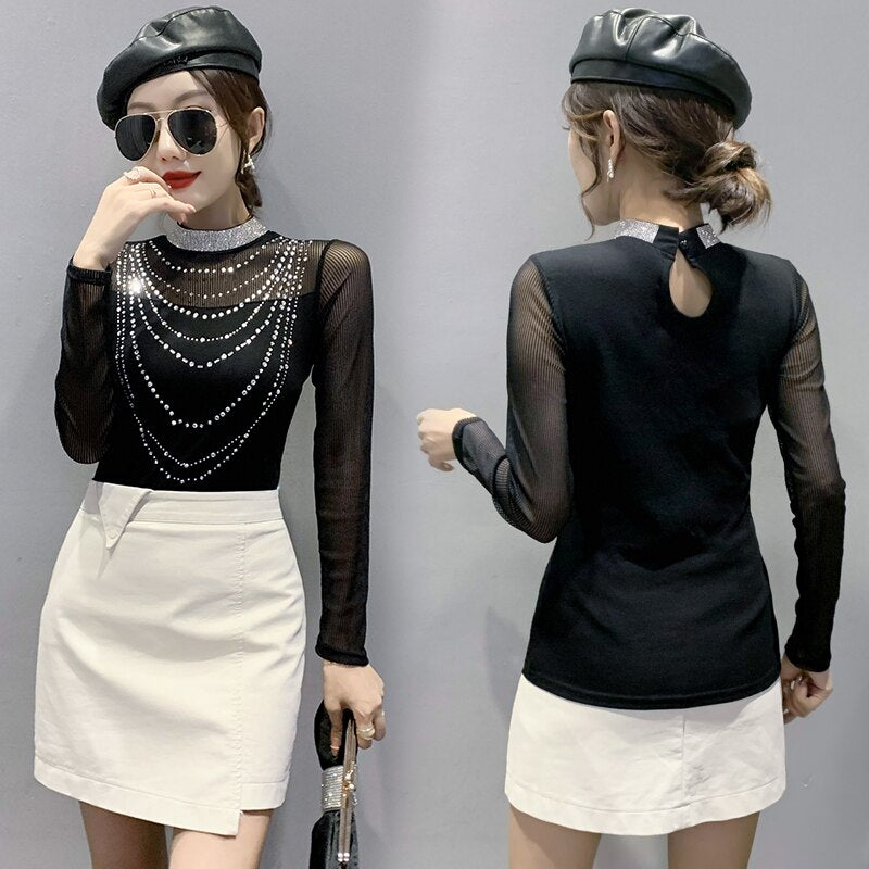 2021 Autumn New Long-Sleeved Stand-up Collar Bottoming Shirt Fashion Stitching Mesh Hot Drilling T-Shirt Tops