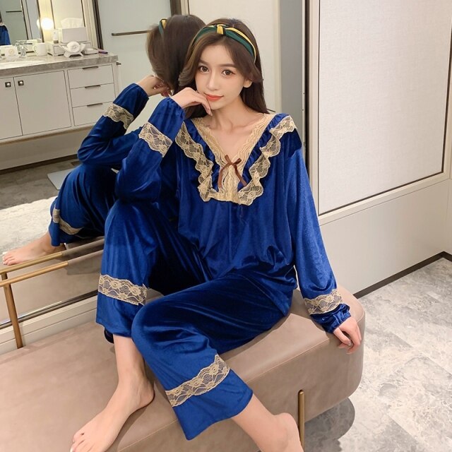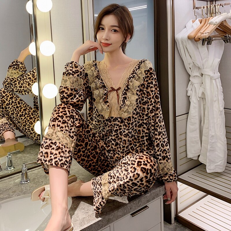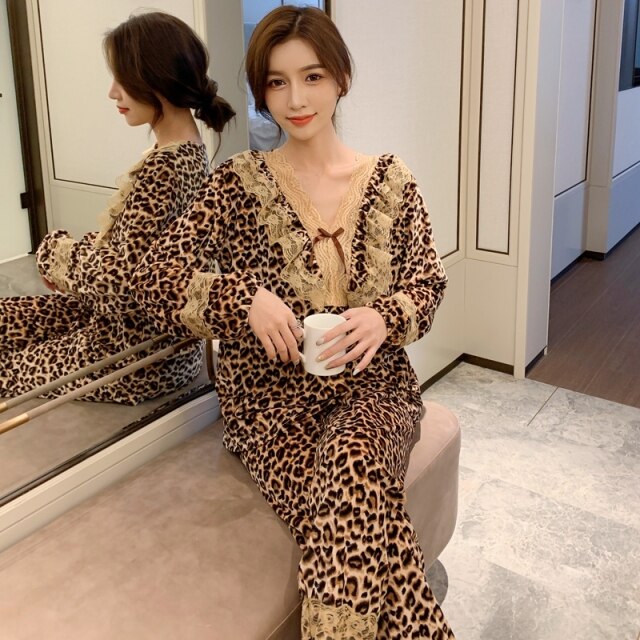 2021 Autumn Winter Gold Velvet Sexy Leopard Lace V-neck Pajama Set for Women Long Sleeve Sleepwear Homewear Pijama Mujer Clothes