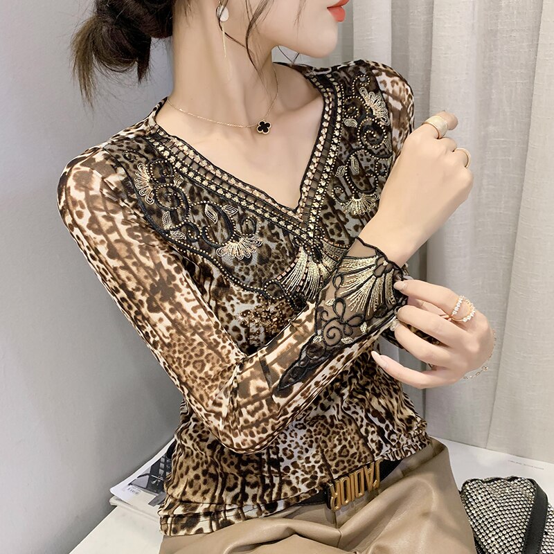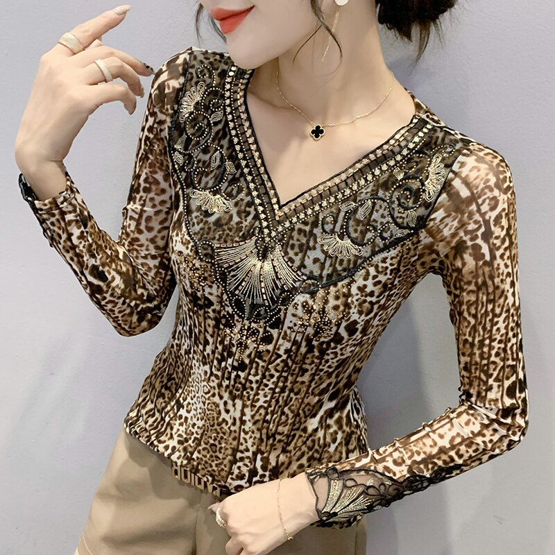 2021 Autumn Winter New Women's T-Shirt Fashion Mesh Stitching Hot Diamond V-Neck Tops Shirt Sexy Hollow Out Leopard tshirt