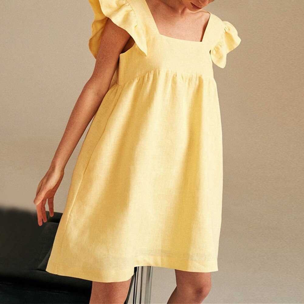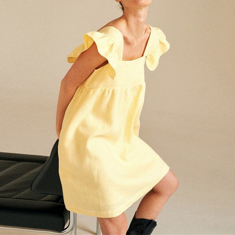 2021 Casual Square Collar Butterfly Sleeve Mini Sweet Dress Summer Woman Backless High Waist Loose Linen Solid Dress