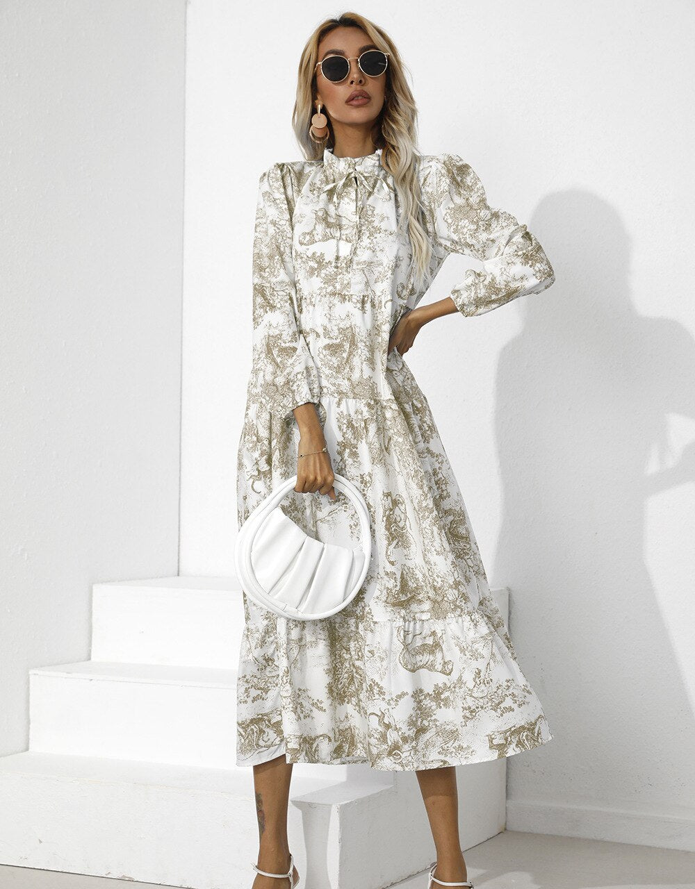 2021 Fall Women's Round Neck Printed Loose Nine Points Sleeve Dress Fashion Ruffle Stitching Big Swing Maxi Dresses Robe Femme