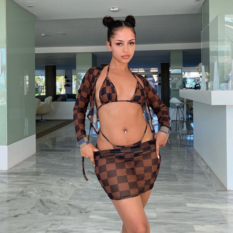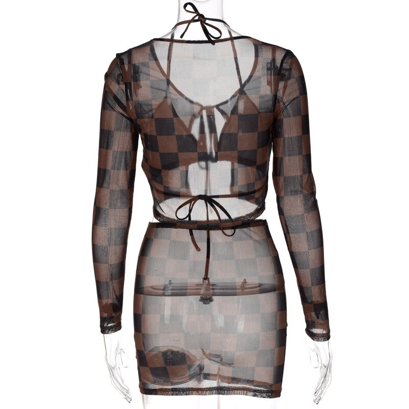 2021 Fashion Trend Personality Sexy Nightclub V-neck Mesh Printed Plaid Jacket Vest See-through Hip Skirt Three-piece Set