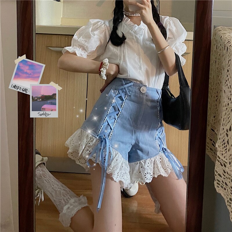2021 Japanese Harajuku Summer Women 2 Pcs Set White Ruffled Collar Blouse+Blue Bandage Lace Ruffles Shorts Cute Kawaii Outfits