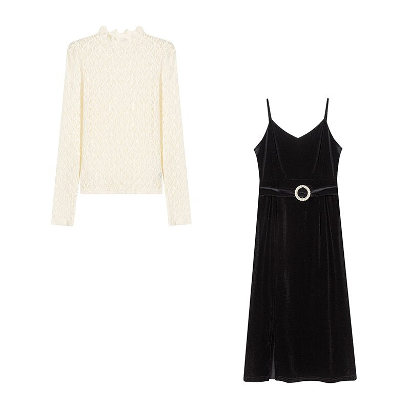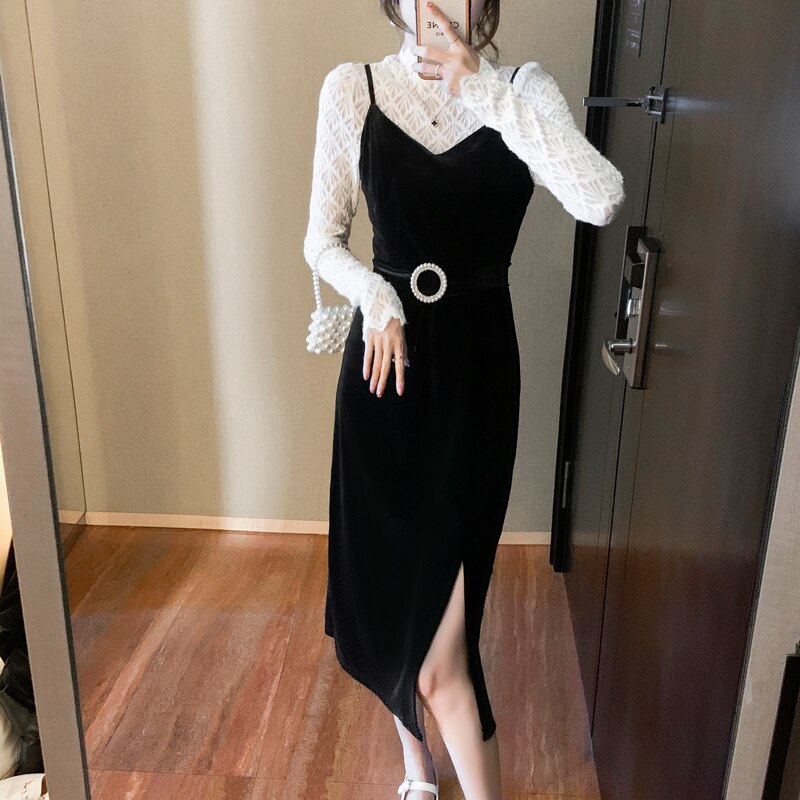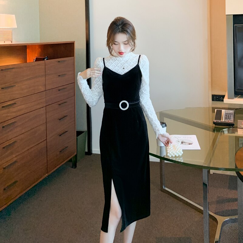 2021 Long Sleeve Lace Stand Collar Top High Waist Split Fork Slim Golden Velvet Sling Dress Women Autumn 2 Piece Clothes Set