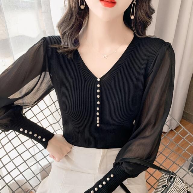 2021 New Black V-neck Elegant Pullover Top Harajuku Bottoming Shirt White Chiffon Bubble Knit Sexy Slim Sweater For Women Autumn