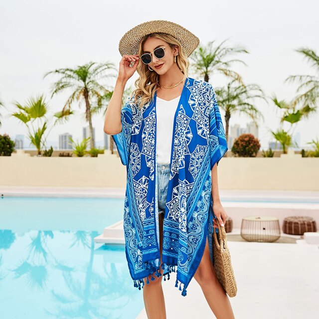 2021 New Bohemian Summer Mid-Length Chiffon Beach Top Floral Pattern Sunscreen Clothing