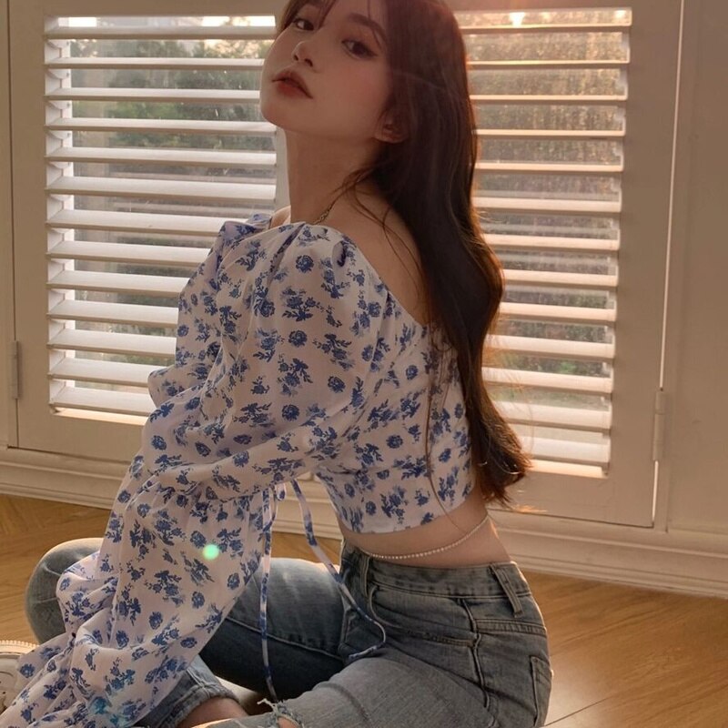 2021 New Floral Top Women White Sweet Square Neck Long Puff Sleeve Ruched Drawstring Crop Top Summer Woman Party Blouse