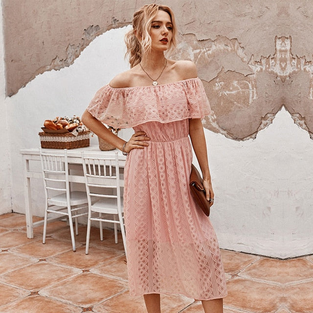 2021 New Ladies Elegant Summer Lace Off The Shoulder Dress Women Casual Slash Neck Solid High Waist Mid-calf Dress