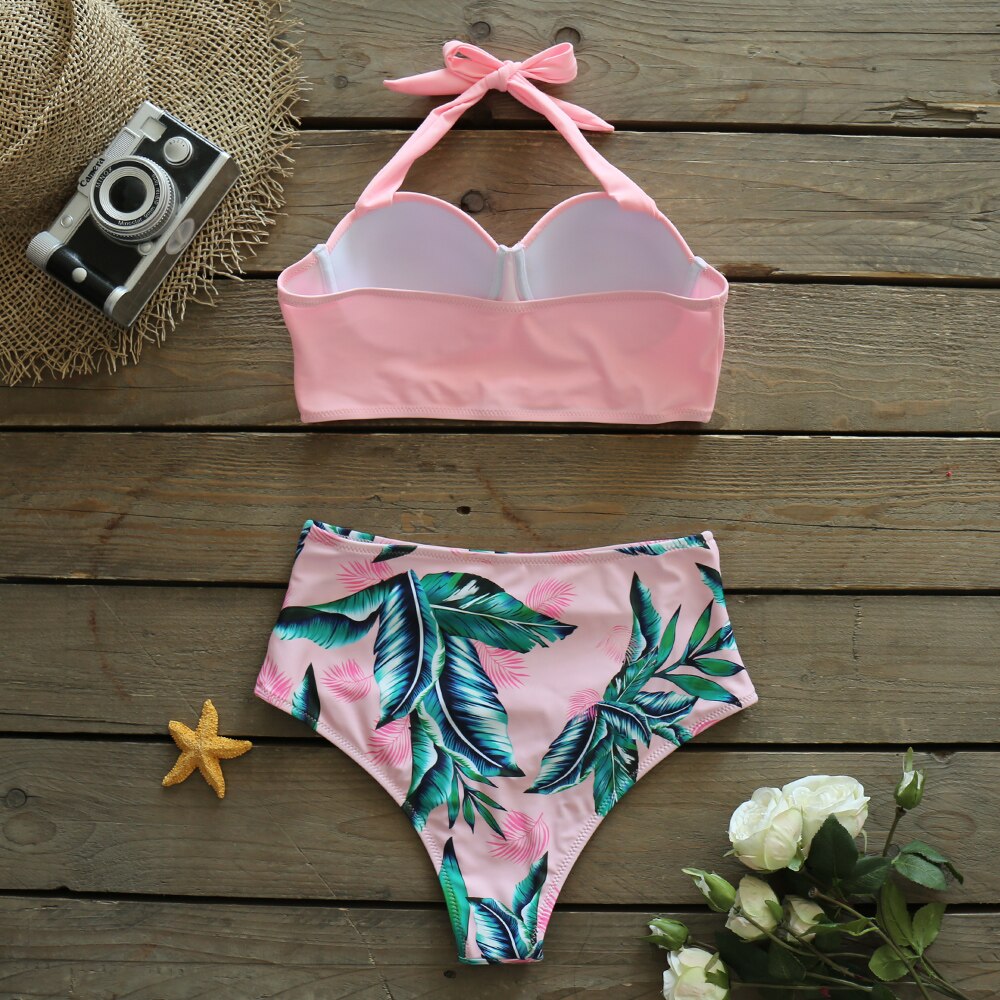 2021 New Push Up Sexy Bikini Set High Waist Swimwear Women Swimsuit Female Halter Bathing Suit  Leaf Print 2 Pieces Beachwear