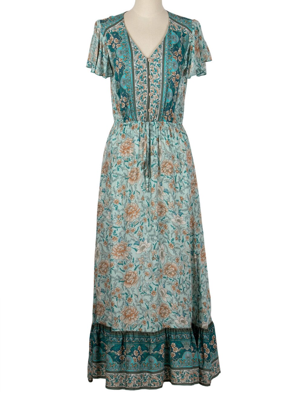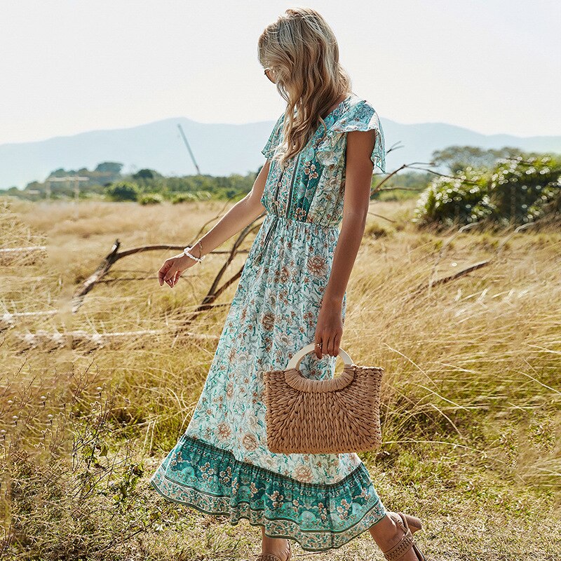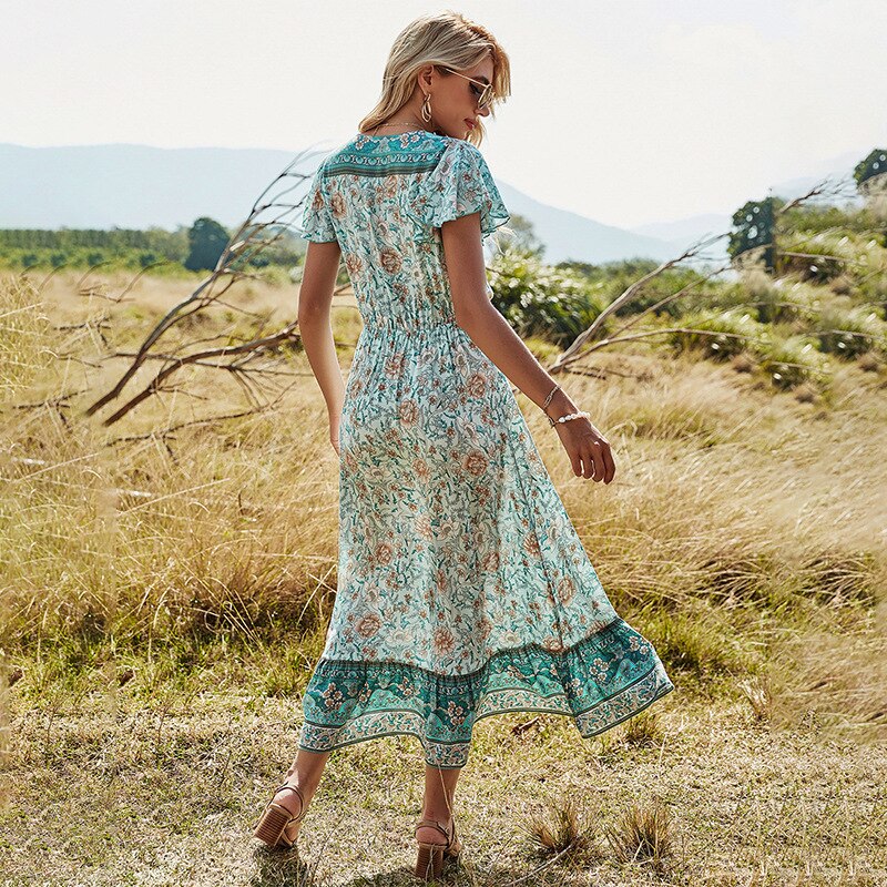 2021 New Summer Beach Maxi Dress Women Floral Print Boho Long Dress Ruffles Casual V-Neck Short Sleeve Sexy Party Dress Robe