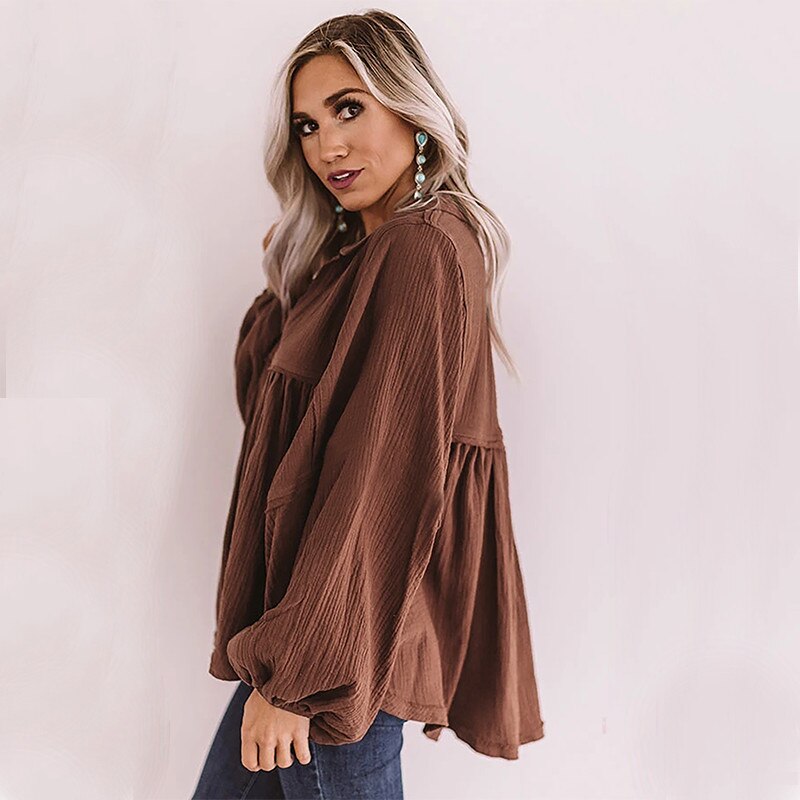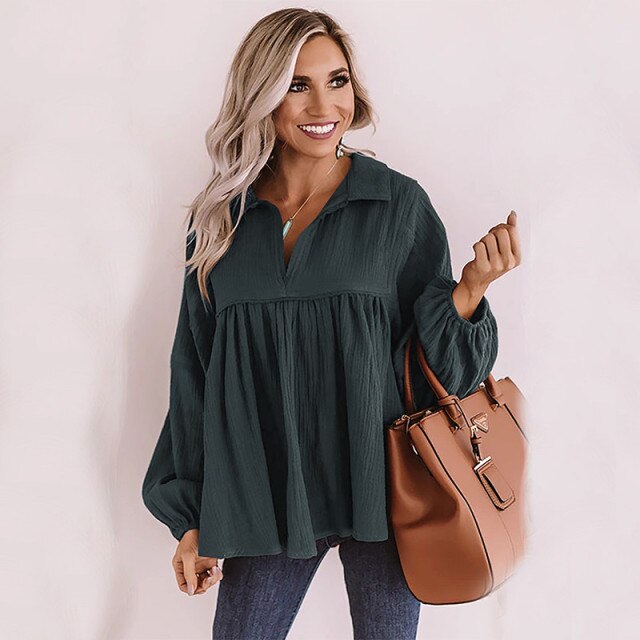 2021 Spring Fashion Solid Shirt Women Casual Loose Turn Down Collar Lantern Long Sleeve Pullover Blouse Lady New Vintage Blouse