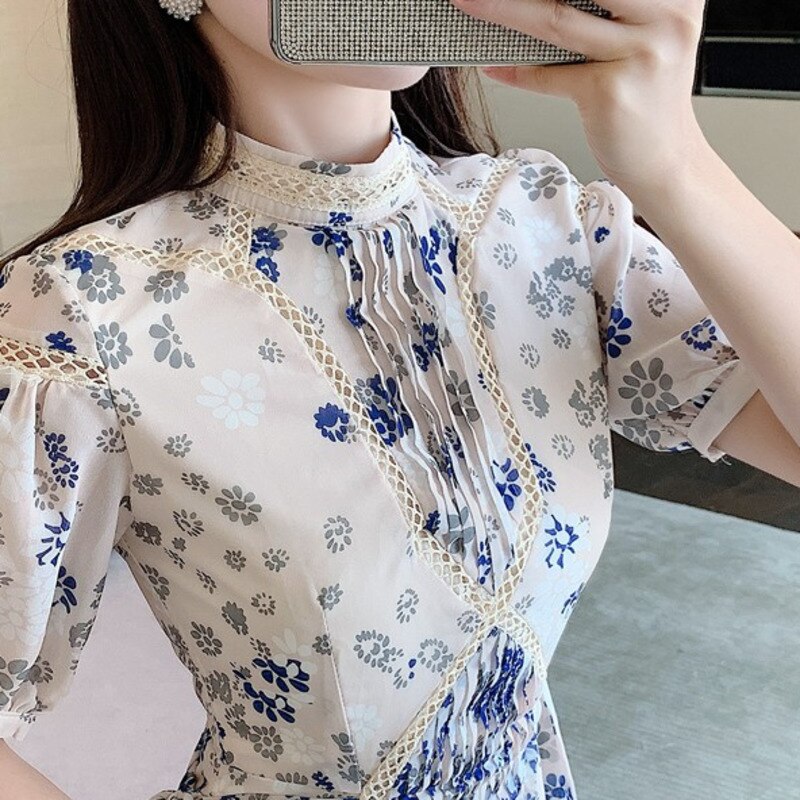 2021 Spring French Niche Blue And White Porcelain Lady Robes Temperament Goddess Waist And Thin Puff Sleeve Floral Dress Vestido