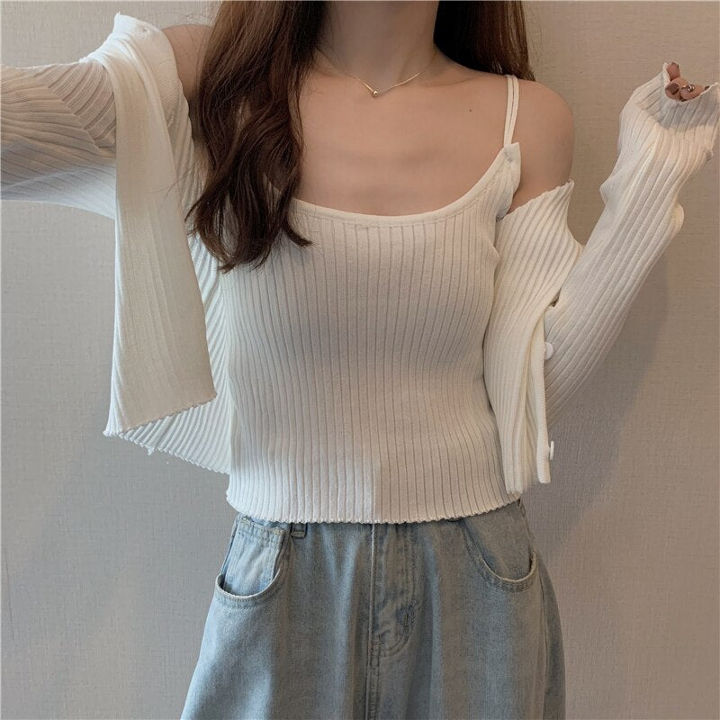 2021 Spring Knitted Suit Casual Fashion Single-Breasted Long-Sleeve Cardigan And Short Sling Vest Two-Piece Set Femme