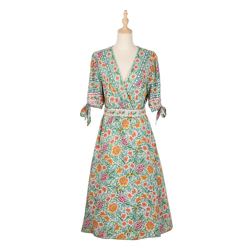 2021 Spring New Print Dress Women Casual V Neck High Waist Half Sleeve Floral Dress For Women Holiday Style Summer Dress