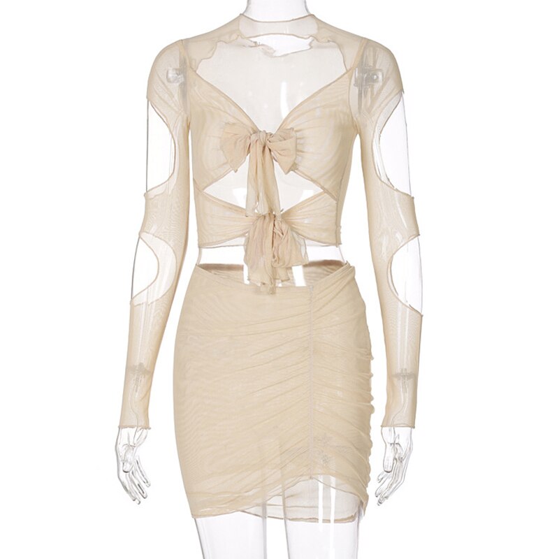 2021 Spring Summer Solid With Sleeves Hollow Out Net Yarn Suit Dress Sheath Drawstring