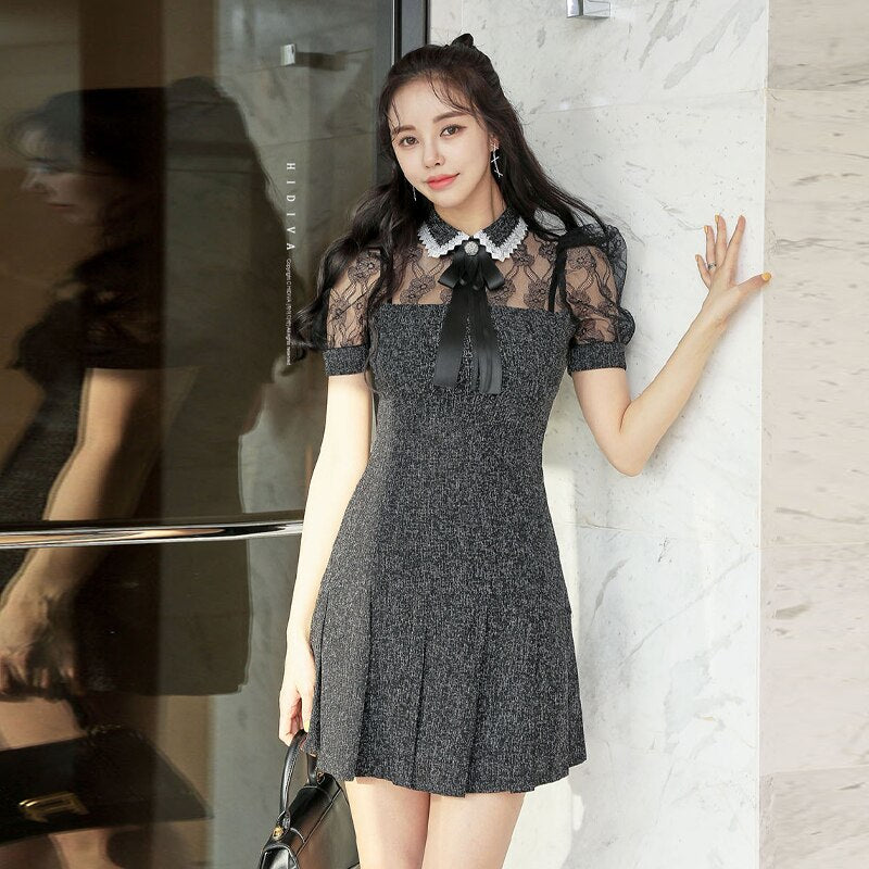 2021 Summer Korean Style Women Elegant Sweet Bow Lace Stitching Slim A-line Dress Office Lady Party Mini Dress Vestido Feminino