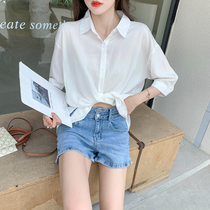 2021 Summer Lapel white medium sleeve temperament fashionable loose shirt workwear versatile sexy backless show thin elegant off