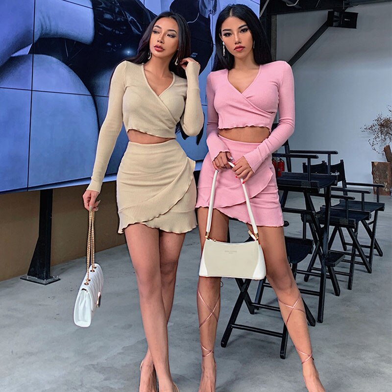2021 Summer New Slim Lotus Leaf Cardigan Long-Sleeved Tight-Fitting Hip Two-Piece Suit