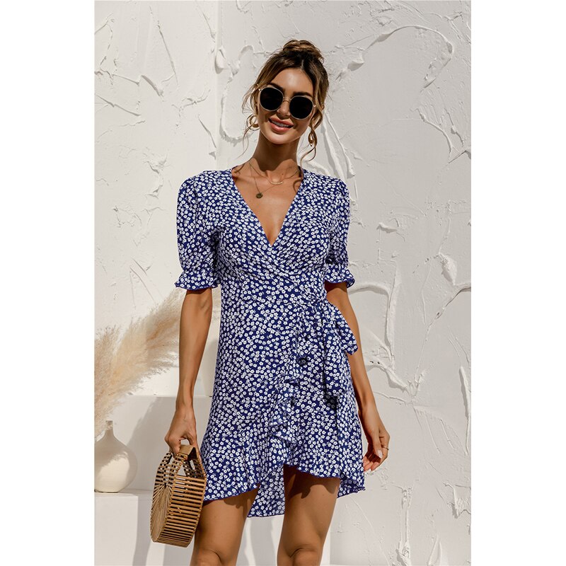 2021 Summer New Women's Fashion Casual Floral Print Deep V Neck Butterfly Short Sleeve Empire Lace Up A Line Ruffles Dress Lady