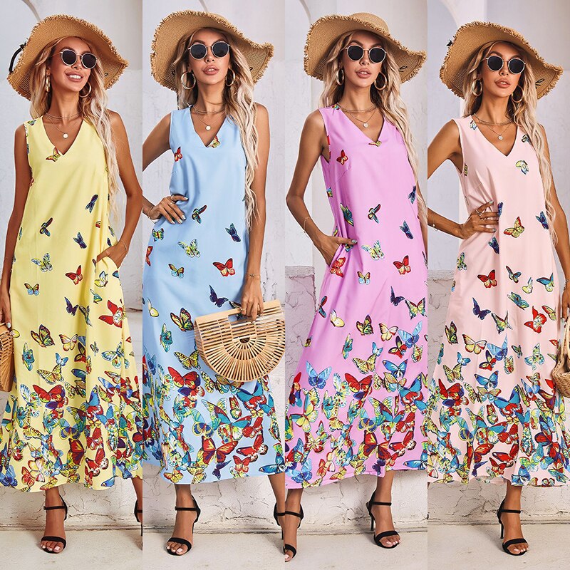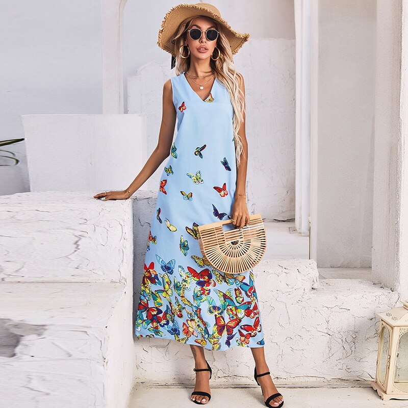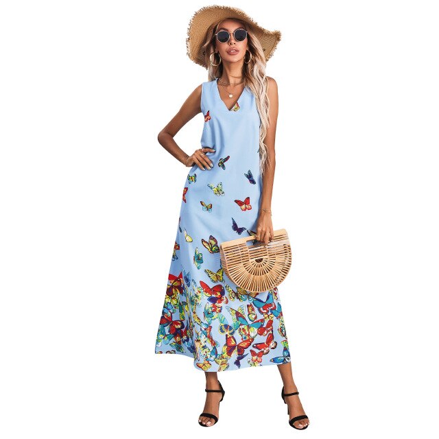 2021 Summer New Women's Fashion Casual Print V Neck Spaghetti Strap Sleeveless Elastic Waist Ankle Lenght Dress Lady Loose Basic