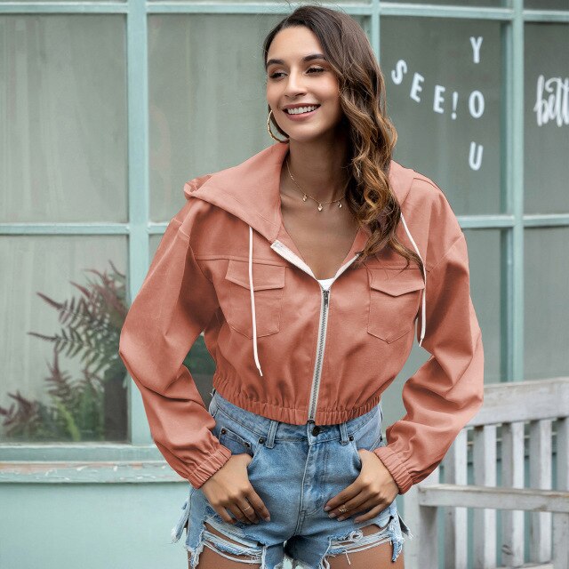 2021 Summer New Women's Fashion Casual Solid Cardigan Hooded Collar Pockets Zippers Long Sleeve Patchwork Slim Short Coat Ladies