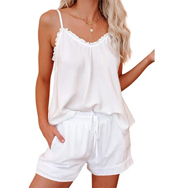2021 Summer New Women's Fashion Casual Solid V Neck Ruffles Spaghetti Straps Sleeveless Top Elastic Waist Lace Up Short Ladies