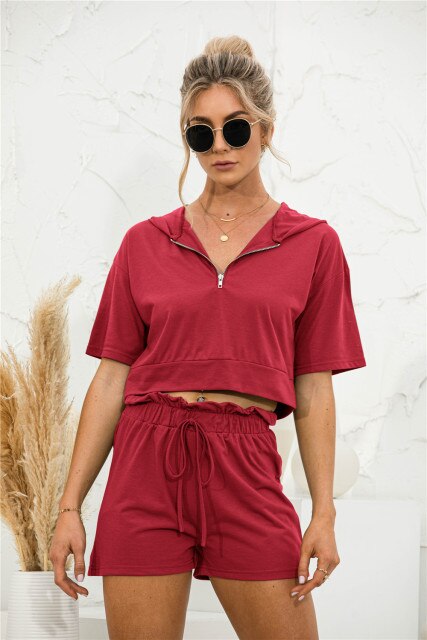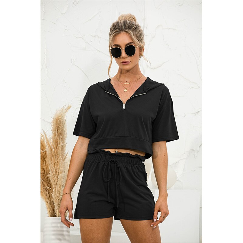 2021 Summer New Womens' Fashion Casual Solid V Neck Zippers Short Sleeve Crops Tops Elastic Waist Lace Up Short Panr Lady Loose