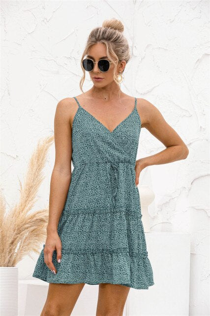 2021 Summer New Women's Fashion Sexy Floral Print Deep V Neck Spaghetti Strap Sleeveless Lace Up Backless Empire Mini Dress Lady