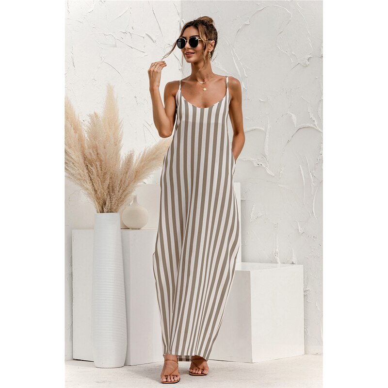 2021 Summer New Women's Fashion Sexy Stripe V Neck Spaghetti Straps Sleeveless Backless Loose Waist Pockets Ankle Lenght Dress