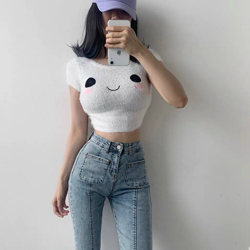2021 Summer Short Sleeve Short Crop Top Slim Round Neck Furry Kawaii Smiling Face White Top Fashion Casual Expression Clothes